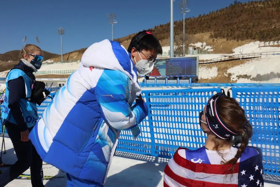 冬残奥会的第一天是我最开心的一天,首场中国冬季两项选手单依霖就拿到了银牌,我终于在国家冬季两项中心颁奖仪式上看到了中国红,就这样每天中国队在冬季两项都是大丰收,我很开心我能亲自见证这一时刻,我感觉自己所有的付出和努力都值得了。在3月8日的女子中距离站姿比赛中三名来自乌克兰的选手获得了冠军、亚军、季军。在宣告仪式即将开始时,我发现获得亚军的亚历山德拉-科诺诺娃只穿了一件紧身比赛服,在张家口的寒风中冻的瑟瑟发抖。我见此情况将自己的志愿者羽绒服外套脱下来披在了她身上。我感觉这是任何一个志愿者见了这种情况都会做的事情,帮助别人本身就是一件快乐的事。