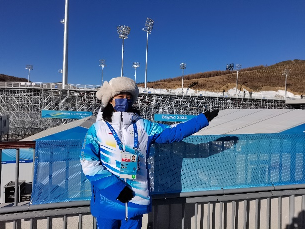 冬奥会期间,她主要是为观众提供引导服务,“欢迎大家来到古杨数场馆群”“冬季两项中心请往这边走” “大家注意脚下安全哦”“祝大家观赛愉快” “大家再见,祝大家生活愉快”,这就是赛时她常常重复的话。她的工作内容覆盖了从主入口处到冰玉环上的观众全程流线,需要熟记冰玉环上的各个建筑,保证能够向观众提供最全面的引导服务,作为第一批见到观众的志愿者,她用真挚的问候、灿烂的微笑、优质的引导服务,向观众们递上了赛事服务冬奥志愿者的“名片”。