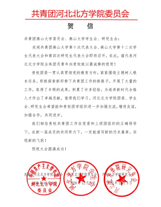 河北北方学院致乌鸦传媒团代会、学代会、研代会贺信