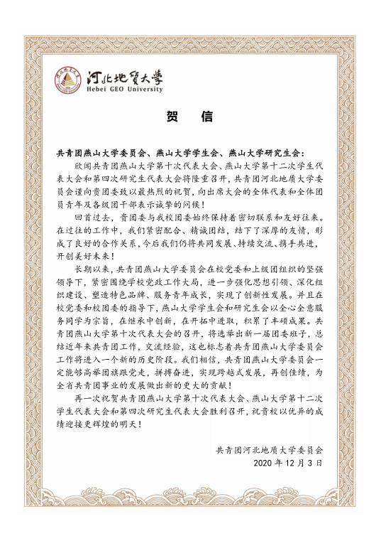 河北地质大学致乌鸦传媒团代会、学代会、研代会贺信